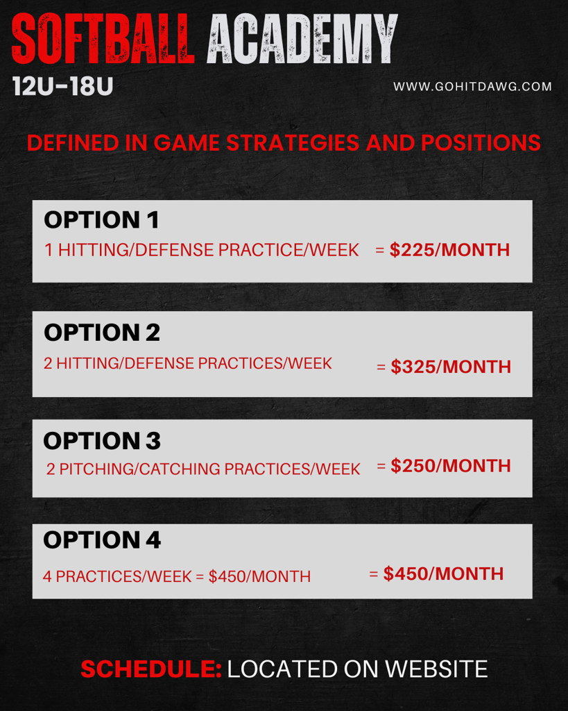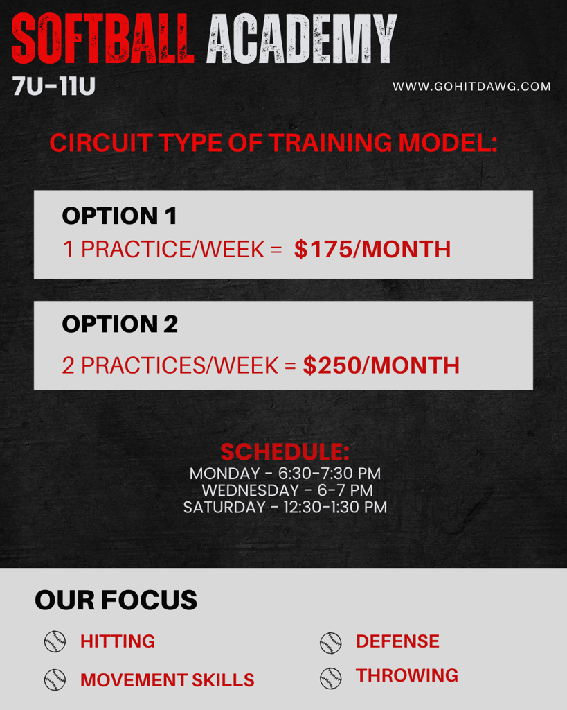 The Hit Dawg Academy's philosophy is based on player development. Anybody and everyone that wants to work hard on their softball skills, and improve as a player is invited to join our program. Our staff is dedicated to getting you prepared to play at the next level. This is a DEVELOPMENTAL OPPORTUNITY. We focus strongly on fundamentals and the necessary mechanics needed to be successful in softball. From there, winning will take care of itself.